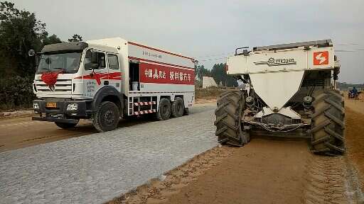在G105宿松段水毀修復及大中修項目上,山東陸達水泥撒布車與維特根3800CR高性能...