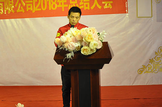 圖為大會(huì)上行政部長(zhǎng)楊斗宣布公司2019年對(duì)各部門主管人事調(diào)整