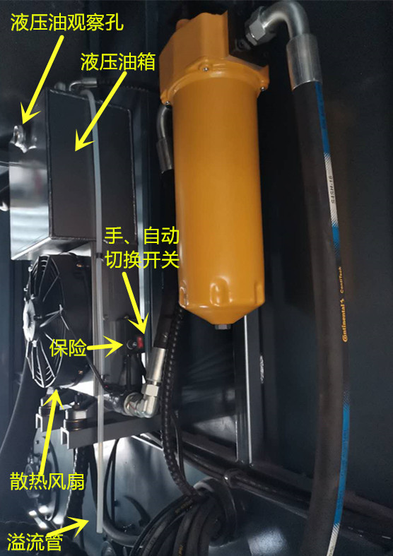 液壓油箱位于前倉內,配裝于前倉倉壁上,主要起到降溫散熱的作用。