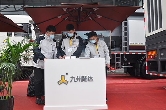 室外E.07展位,山東陸達機械設備有限公司(以下簡稱“山東陸達”)攜九州陸達牌粉料撒布車、九州陸達牌水泥凈漿灑布車兩款系列產品精彩亮相,現場更有精美禮品相送。