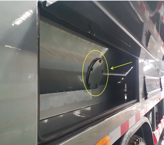 1、多次疏通如無法恢復正常運轉,配有絞龍疏料口的,可以打開疏料口再次測試(箭頭指示位置),如沒有效果,則需要進入車廂內掏料處理。進入車廂處理應注意通風散塵,做好個人安全防護,并至少有一人協助處理。