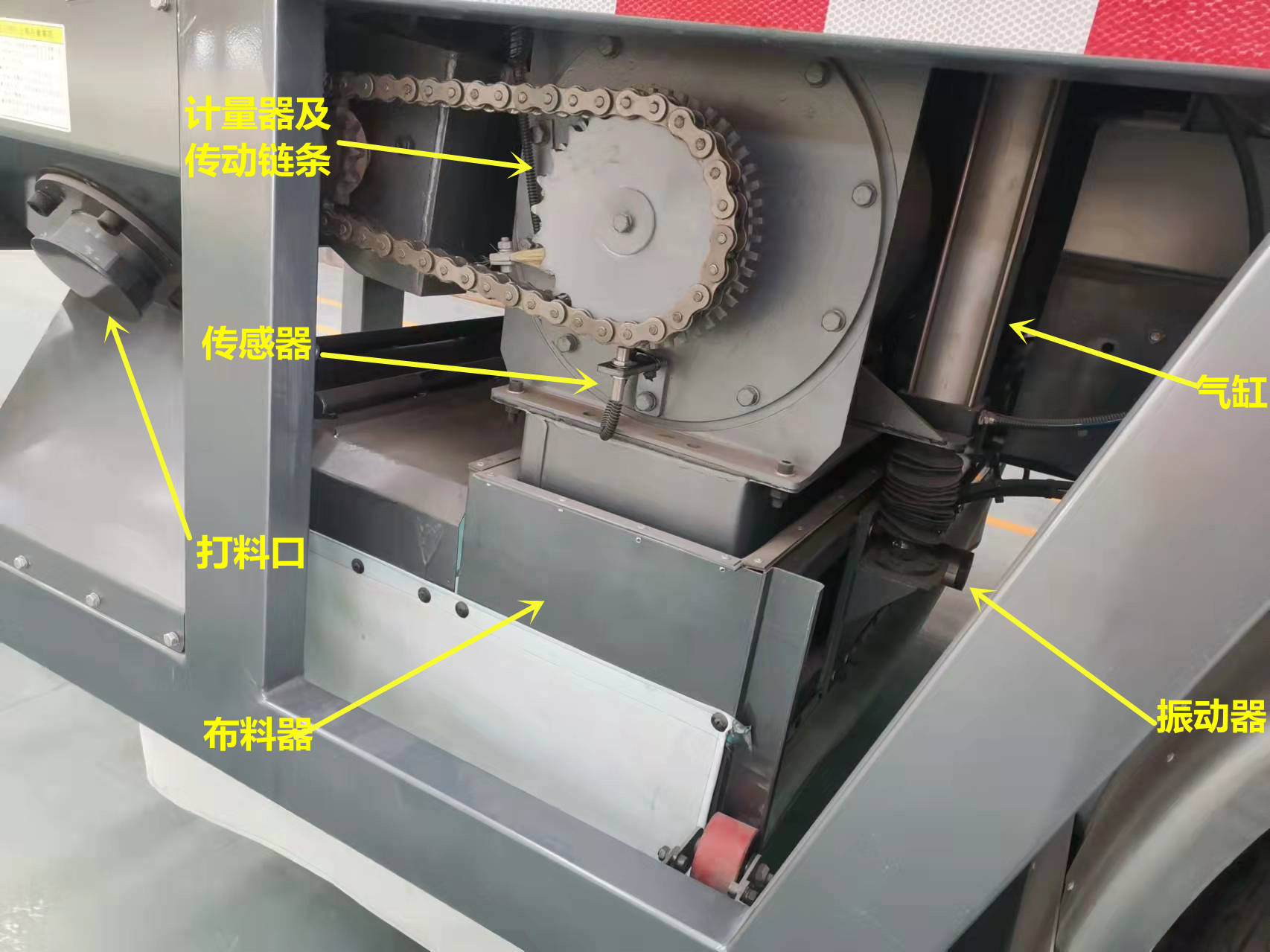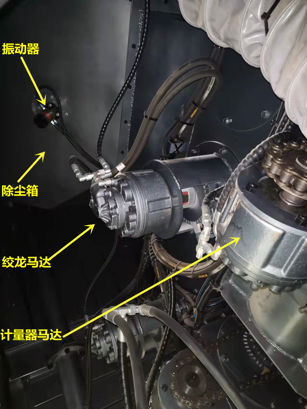 4、后倉主要零部件有:計量器及傳動鏈條、傳感器、打料口、布料器、氣缸、布料器及除塵箱振動器、絞龍及計量器馬達、除塵箱。