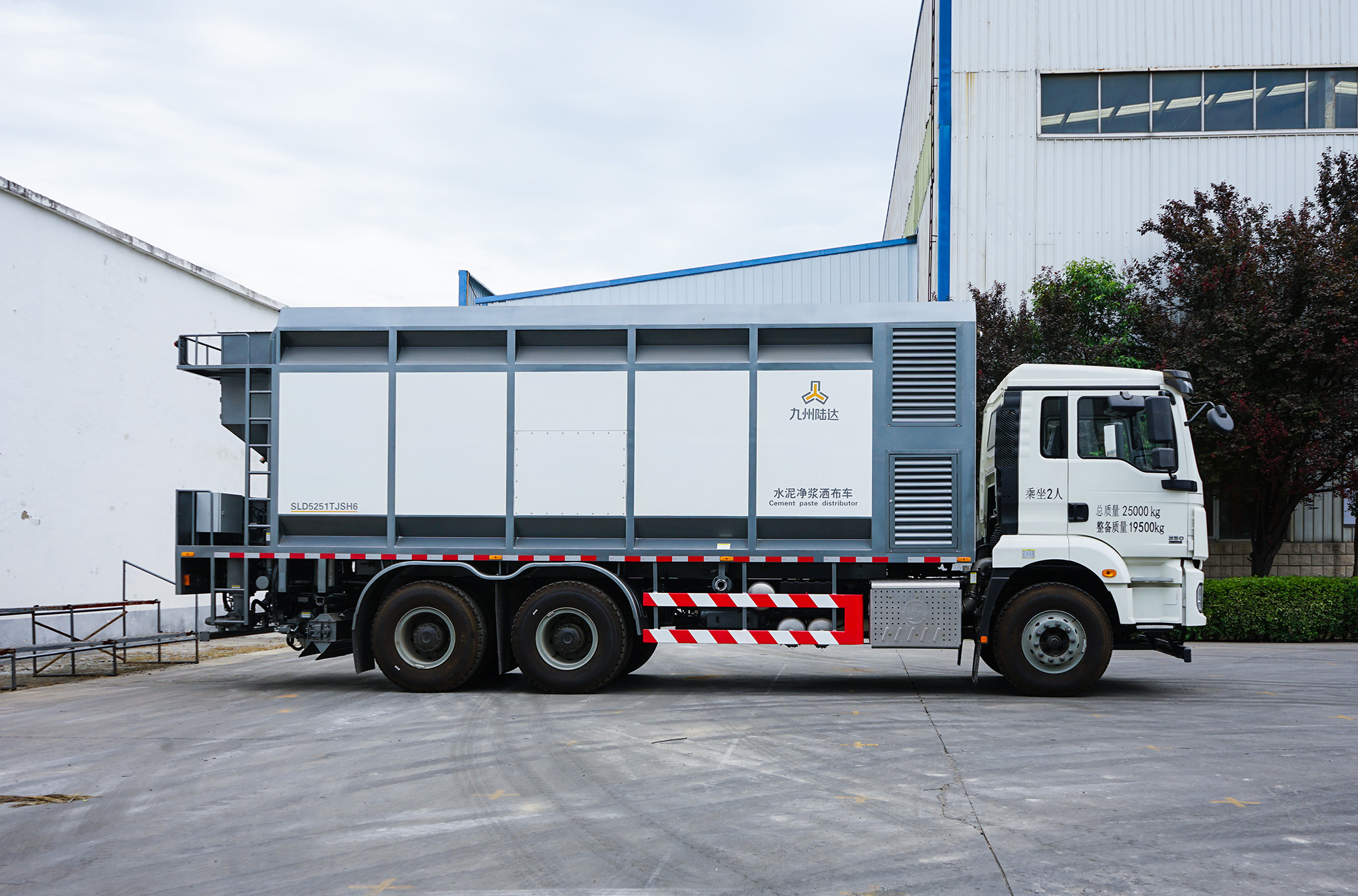 灑布車水罐容積8m³,粉料廂16m³。采用與水泥罐車連接的上料方式,和水車的管道直連,保障了設(shè)備的連續(xù)作業(yè)能力;